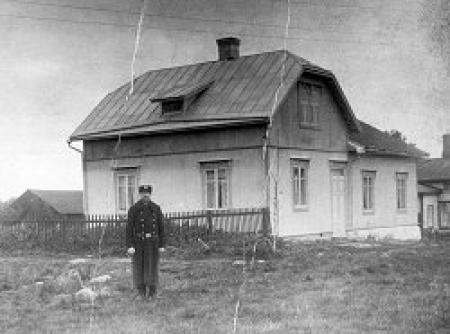 Bilden visar polisen Juha Lahtinen när han står på den plats som nu är korsningen Skillnadsgatan- Öhbergsvägen. Husets tillbyggnad, d.v.s. den del av byggnaden som finns bevarad är den till vänster. Den lägre delen har rivits.
